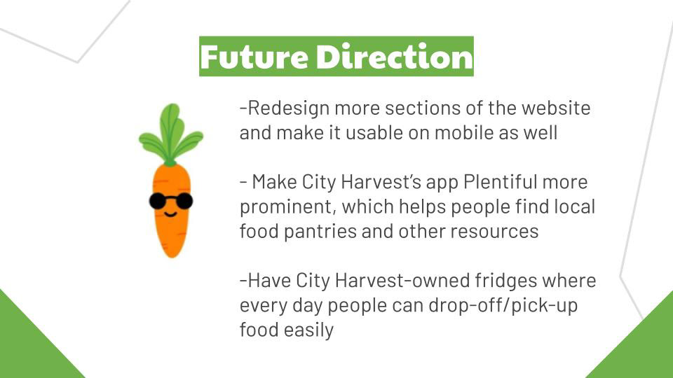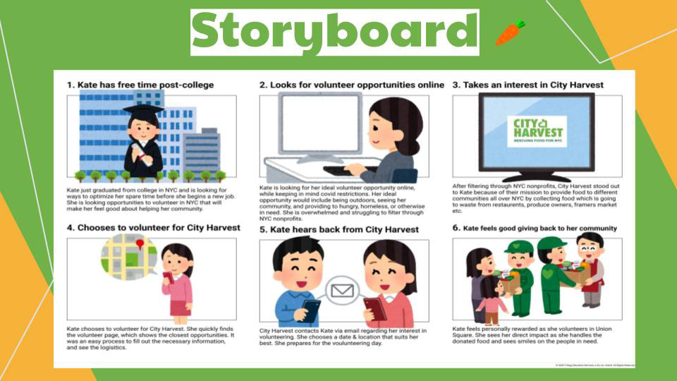 City Harvest’s website was designed to provide education about food insecurity issues in the city and information on a variety of programs for New Yorkers who want to get involved. We have observed that the existing website does not clearly convey City Harvest’s mission and makes it difficult for people to find opportunities they are interested in, which is causing distrust in the organization, confusion about its mission, and decreased involvement. How might we improve City Harvest’s website so that New Yorkers can easily understand, trust, and sign up for the many available programs - which will ultimately increase the number of volunteers and donations for City Harvest.